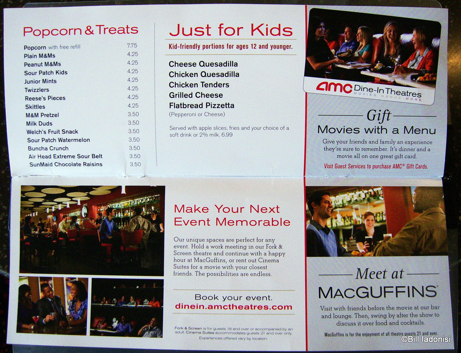 AMC’s Fork and screen first debuted in 2008 in Buckhead, Georgia. There are also theaters in New Jersey, Texas, Phoenix, and Kansas City. The menus are the same in all of the theaters, and were designed by corporate chef Jason Henderson. The food is robust roadhouse fare, similar to Chili’s or Outback Steakhouse.
