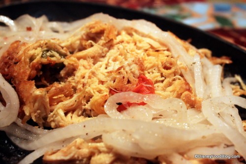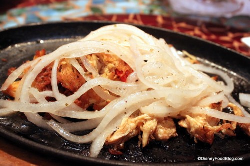 I chose the Vaca Frita de Pollo, or shredded chicken, on our server’s recommendation. It arrived at our table sizzling on a cast iron skillet.