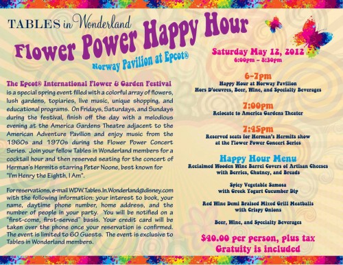 Held in the special event space atop the Norway Pavilion at Epcot®, join your fellow Tables in Wonderland members for a cocktail hour and then reserved seating for the Flower Power concert of Herman’s Hermits starring Peter Noone, best known for “I’m Henry the Eighth, I Am”.