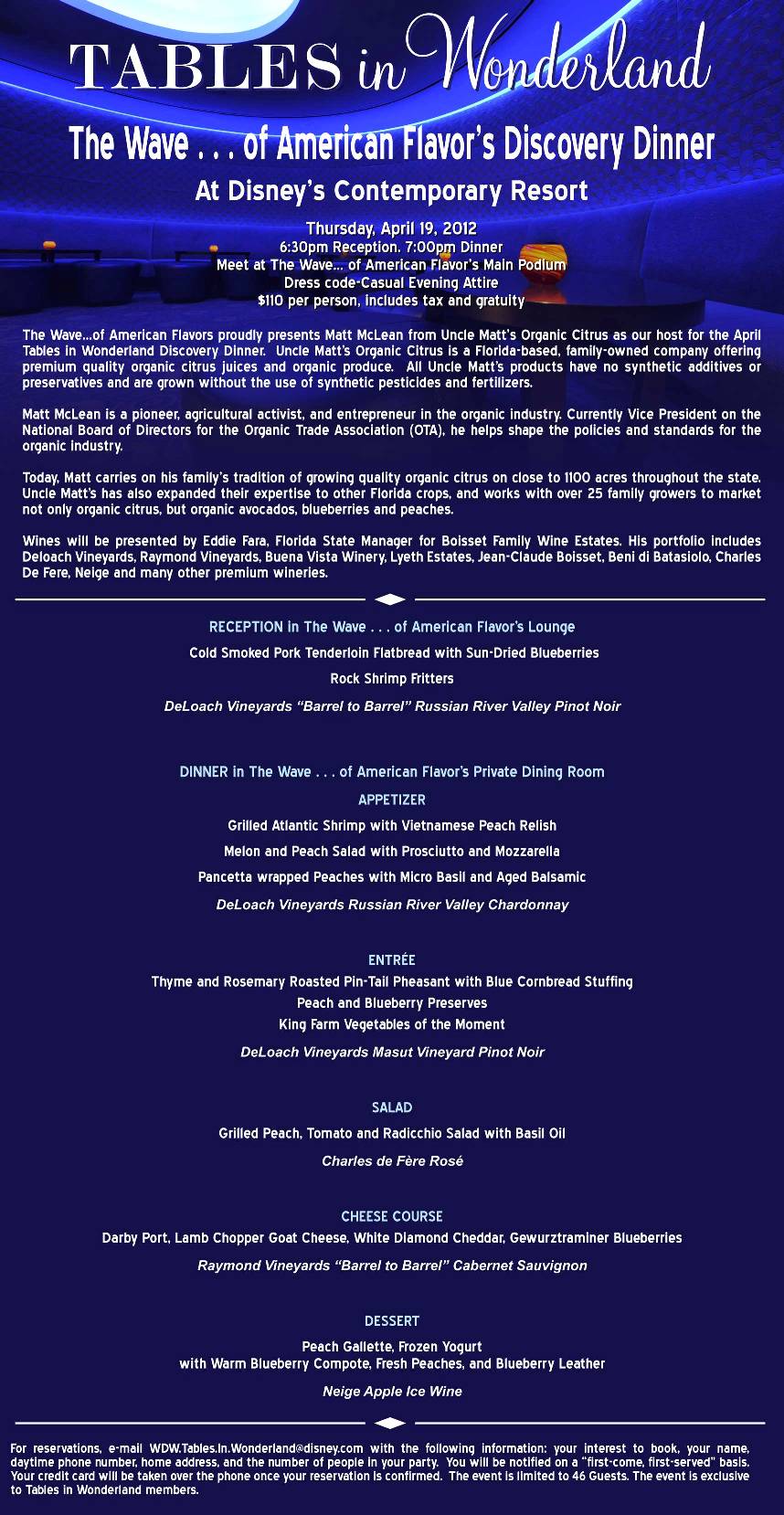 There are some fun Tables in Wonderland perks and events over the next couple of months! First up, members will receive a discount on Cirque du Soleil: La Nouba tickets in Orlando’s Downtown Disney from April 17th-May 11th! Next, another Flower Power Happy Hour will be happening in May. And The Wave has another great dinner planned!