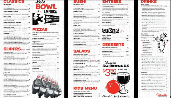 Come on — filet mignon at the bowling alley? 60-ounce alcoholic drinks? Awesome. I’m pretty excited to try those Firehouse Sliders and the Kool-Aid Bowl myself…