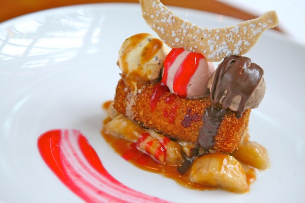 banana split Monte Cristo sundae with raspberry and chocolate fudge ice creams, toffee nuts, and warm caramel rum bananas