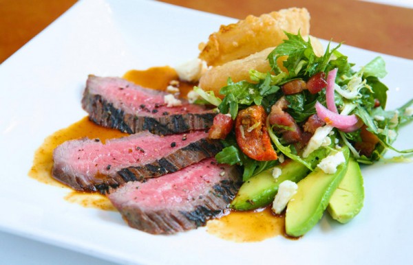 Angus flank steak cobb salad with Mine Shaft Blue Cheese, bacon, avocado and arugula with Cabernet essence