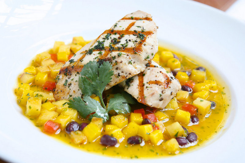 On the dinner menu, sample Colorado rack of lamb with fried zucchini blossoms, fennel puree, and summer succotash; grilled Jamaican jerked kingfish with a tropical salsa of pineapple, mango, black beans, and lime; and strawberry-lemon roasted organic chicken salad with jicama, haricot verts, upland cress (greens), and buttermilk-lemon vinaigrette.
