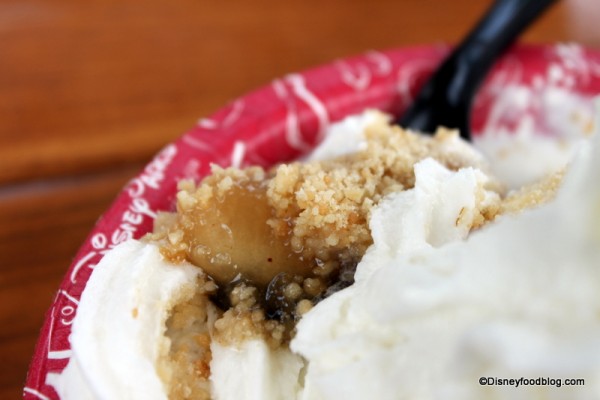 On to the coveted Apple Crisp!! The sundae is served with no whipped cream or cherry; instead, it’s topped with caramel sauce and streusel! Fancy.