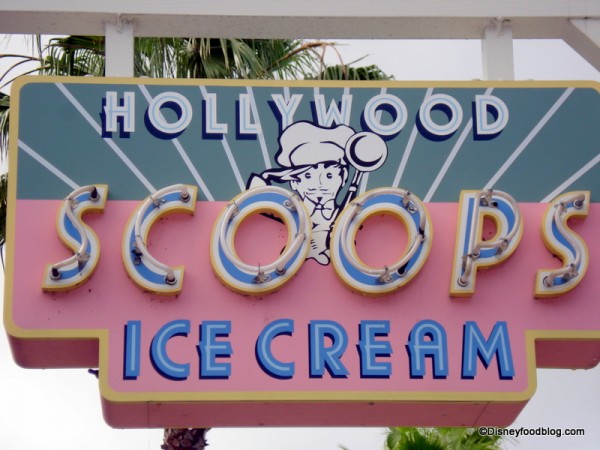 Beneath the Tower of Terror’s ominous shadow at Disney’s Hollywood Studios in Walt Disney World, you’ll find the fun blue and pink sign for Hollywood Scoops Ice Cream!