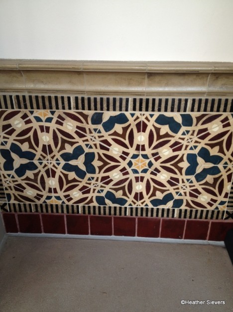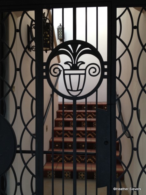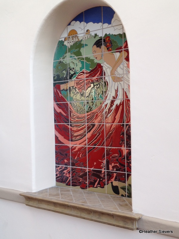Walking around the perimeter of the building, I noticed lots of fun details. I love the mosaic tile work — especially the boarder at the bottom of the building. The Spanish dancer is lovely too. Is that Griffith Observatory in the background???