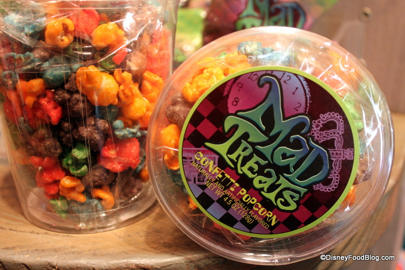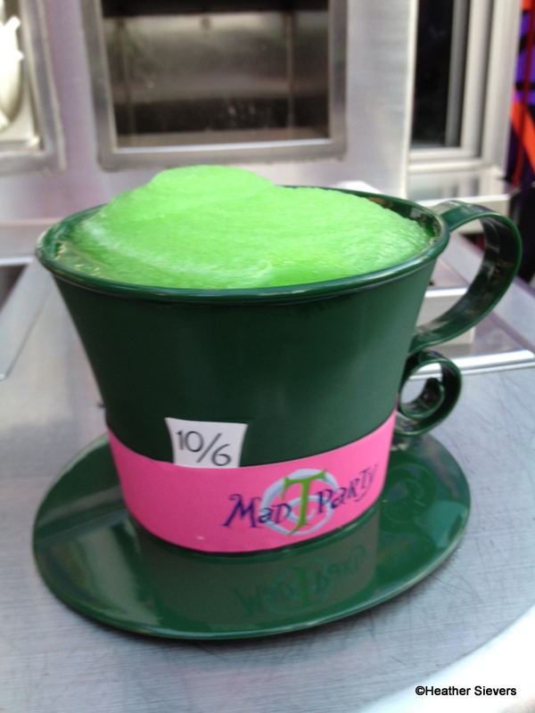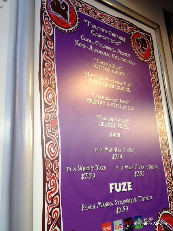 So come on people, mix your “Jabberwocky Juice” and your “Tweedle Blue!” Frozen drink options are: Tweedle Blue (Cotton Candy), Hatter’s Mandarin Fury (Mandarin Orange), Jabberwocky Juice (Granny Smith Apple), and Cheshire Chiller (Desert Pear). In a plain ol’ plastic cup they are $4.19, or you can get them in souvenir cups for $7.19-$7.59.
