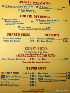 So whaddya get to eat in such an interesting fast food restaurant? Being a barbecue joint, the big-ticket items on the menu include chicken, a pulled pork sandwich, and a slab of St. Louis ribs. You can also get a smoked turkey breast sandwich and a barbecue chicken salad. Side orders include coleslaw, beans, french fries, and onion rings.