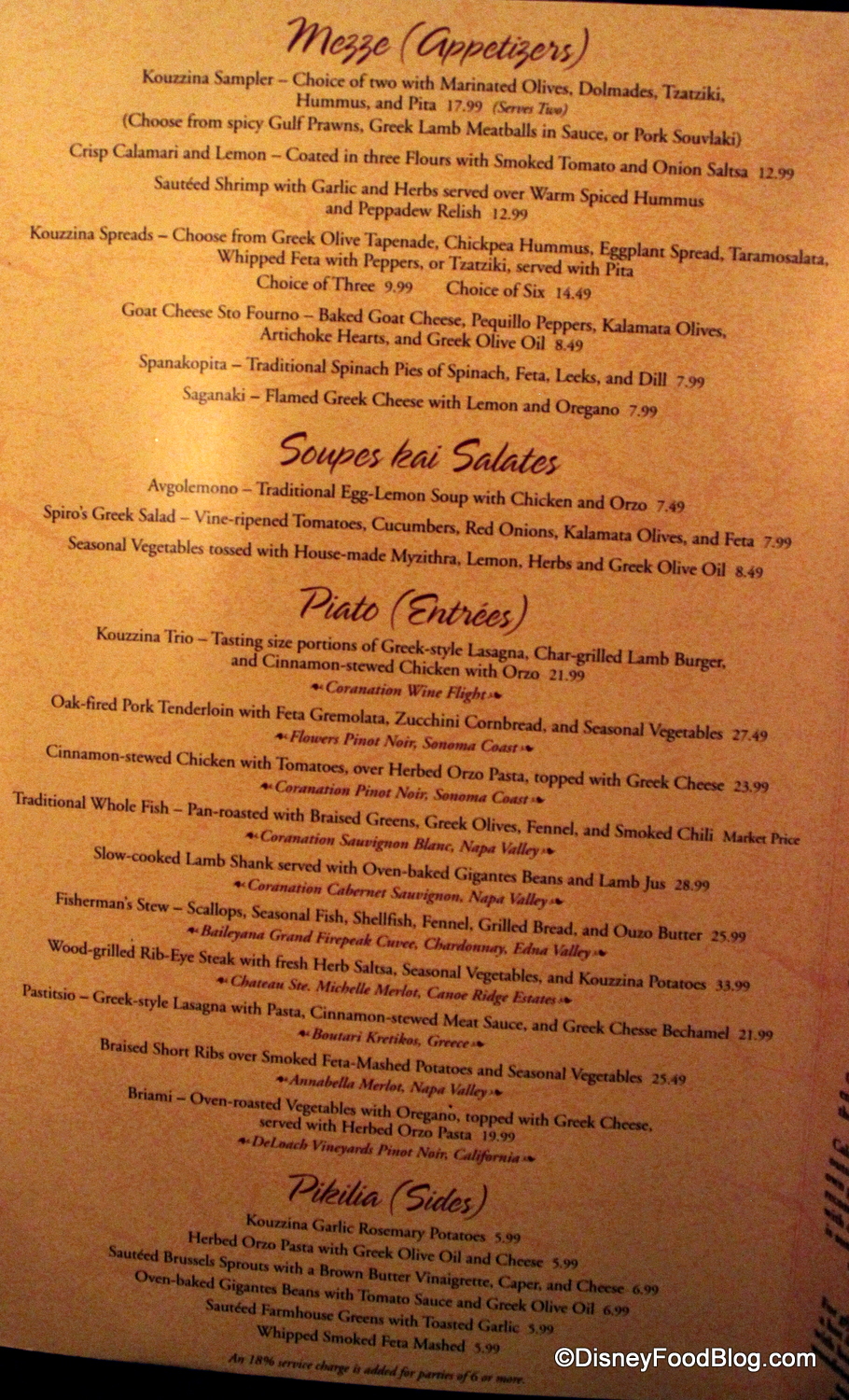 I am learning through multiple visits that there are must-haves on this menu for me (saganaki, anyone?) and dishes that are going to leave me wanting (the Greek lasagna, whatever the name, just doesn’t live up to my expectations.) However, there is enough that we enjoy about this cozy spot on Disney’s Boardwalk will keep us coming back for more.