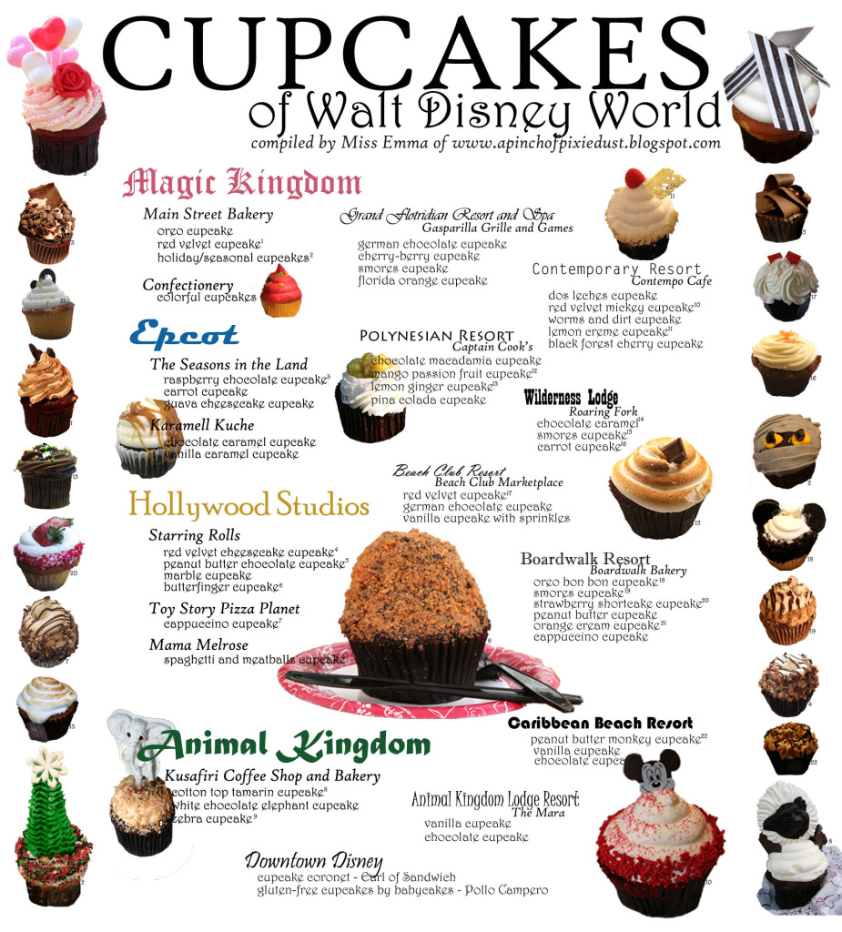 Emma from A Pinch of Pixie Dust has done an AMAZING job of researching and compiling this handy-dandy guide to many of the cupcakes found around Walt Disney World. Personally, I think this awesome guide should be blown up to poster size and framed! (UPDATE! Emma’s turned this into a poster that you can purchase! Find it here!)