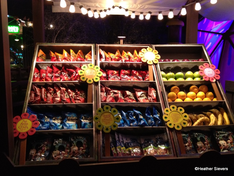 Fillmore’s signage is cleverly made of mufflers dangling from hubcaps, and his tent is just a “prop.” My guess is that inside is a storage area. The actual store consists of stands filled with what Disney calls “healthier” snacks and drinks.