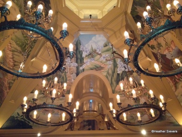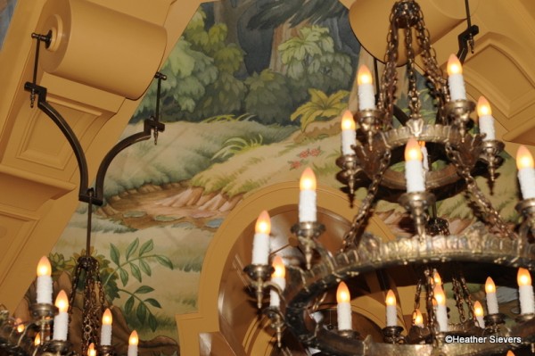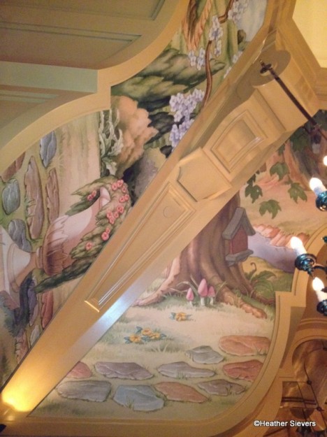 The ceiling mural featuring paintings of Snow White backgrounds is very subtle. There are no characters, but if you know what you’re looking at, it does seem very familiar.