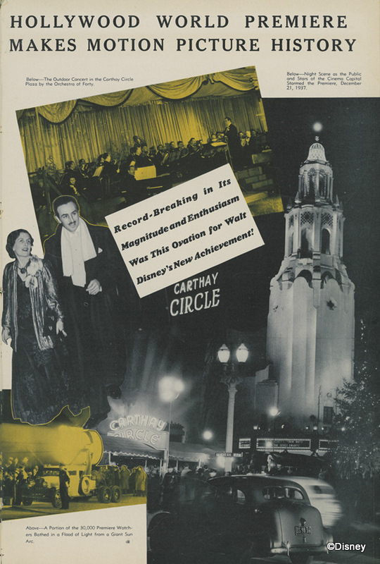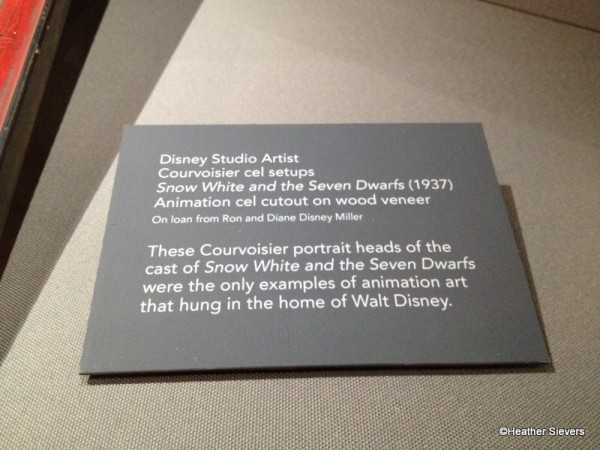 Several images from the evening Snow White premiered hang next to a “Police Pass” from that night and a gorgeous display of Seven Dwarfs animation cells, which were said to be the only animation art that hung in the home of Walt Disney.