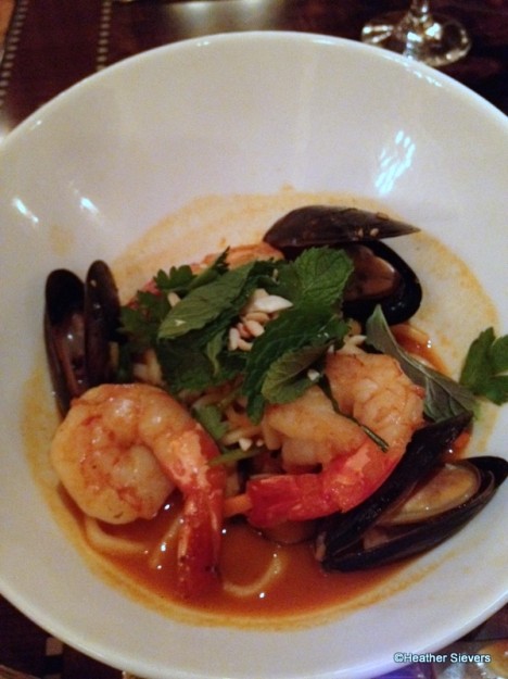 My husband went with the Udon Noodle Bowl with Red Thai Curry Broth, Shrimp & Mussels, Shitake Mushrooms, Bok Choy, Daikon (white radish, I looked it up!), Mint, Cashews, and fresh Coriander. This dish came highly recommended by one of the managing Cast Members who visited our table.