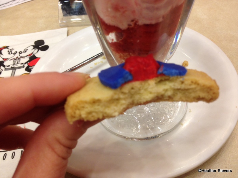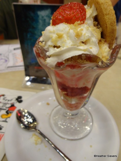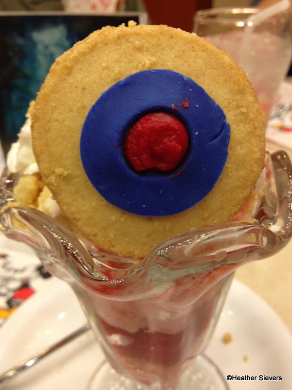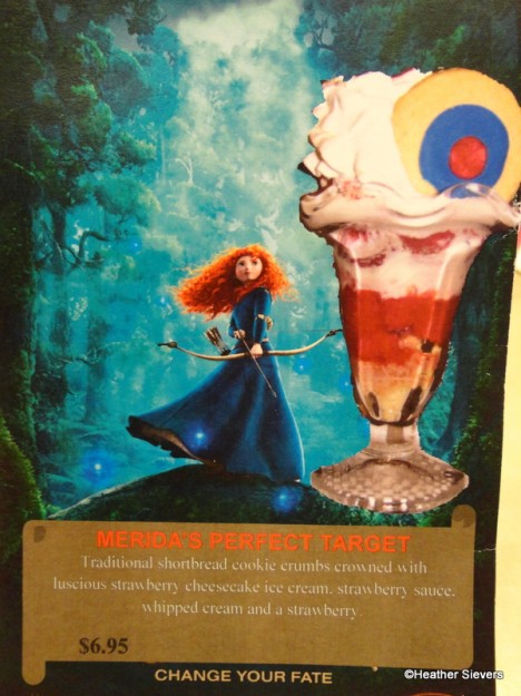 After the movie, we headed next door to Disney’s Soda Fountain to check out their newest ice cream creation inspired by Brave: Merida’s Perfect Target. The sundae features shortbread cookie crumbs topped with strawberry cheesecake ice cream, strawberry sauce, whipped cream, and a fresh strawberry.