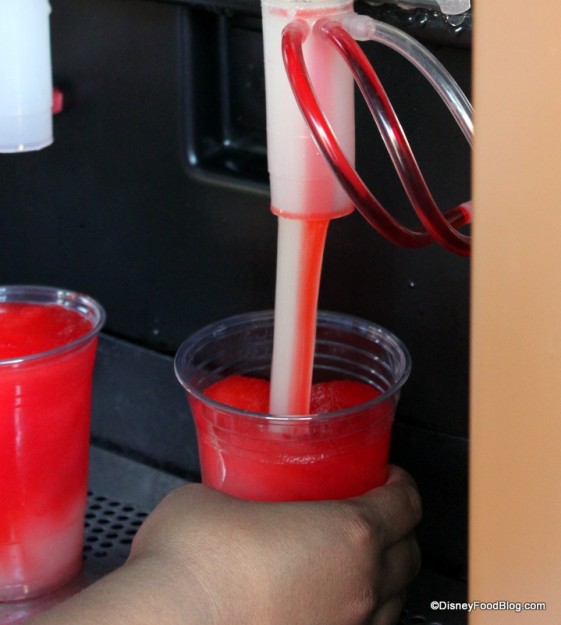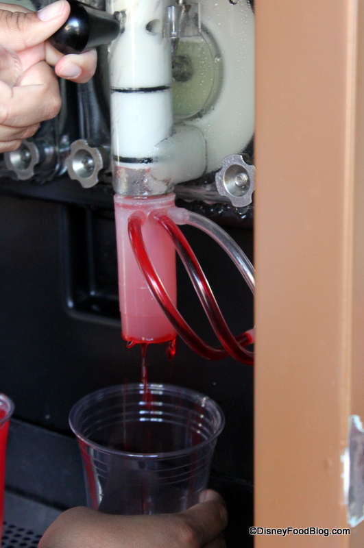 But this wasn’t just any frozen lemonade. These lemonades were available with made-to-order flavor shots in either cherry or raspberry! The awesome Cast Member (shhh!) let me go behind the counter to get some great shots of her flavor shot technique.