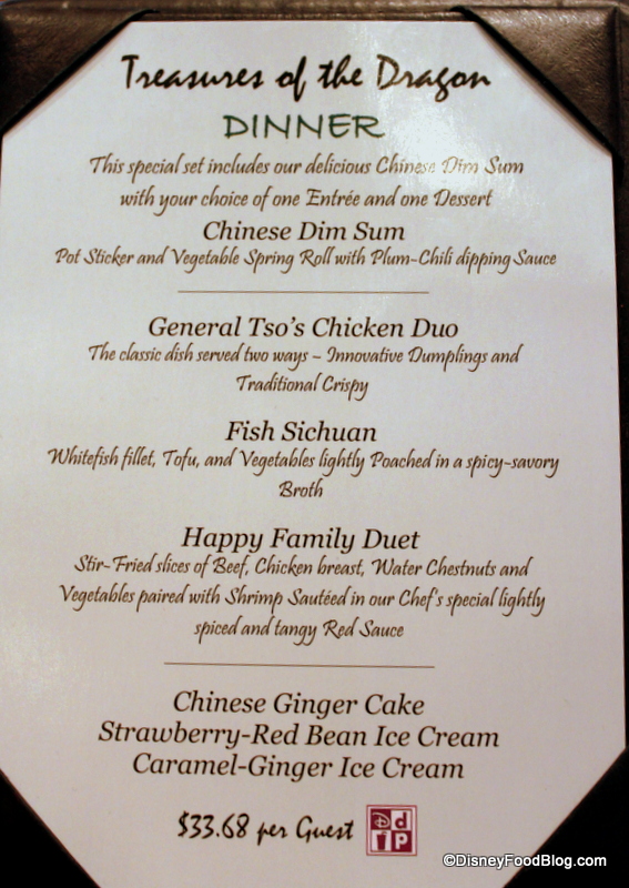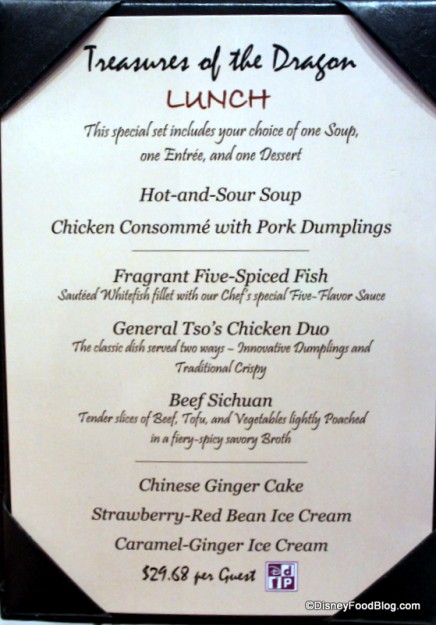 Nine Dragons offers a really excellent prix fixe option for both lunch and dinner. Their Treasures of the Dragon menu includes three courses for a set price, and is also available to guests using the Disney Dining Plan. (Be sure to confirm this if you have an upcoming Advanced Dining Reservation, however, since the rules of the 2013 DDP say that it doesn’t cover prix fixe options.)