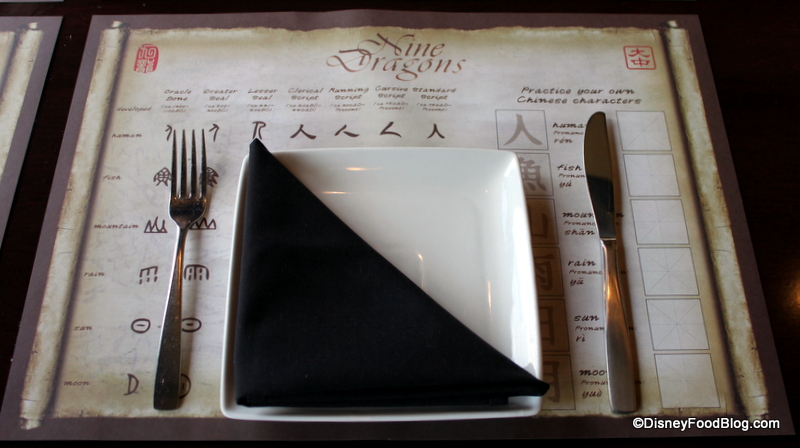 One of my favorite things about Nine Dragons are the placemats. I know…strange, but true. They feature examples of Chinese calligraphy, with space to practice your own character drawing. Fun and educational. This place is Epcot, through and through.