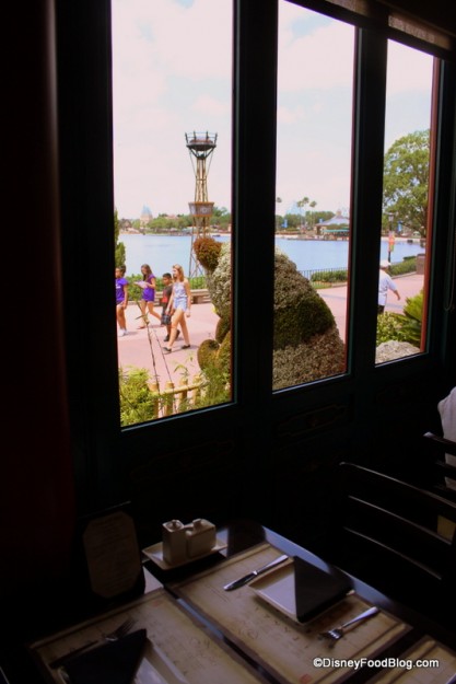 The views through the front picture windows will remind you that you haven’t left Epcot behind. I love the view of the World Showcase Lagoon, and I wonder if this spot wouldn’t be bad for Illuminations viewing… anyone have experience?