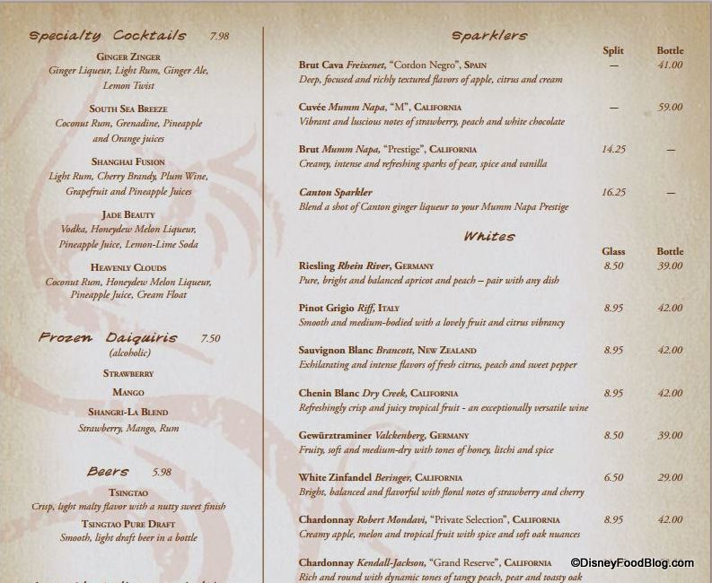 Funny but I have never eaten at the China Pavilion before and I have been going to Epcot since 1982. I think it is because I have lived near two Chinatowns (S.F. & Honolulu) and have been spoiled with killer Chinese cuisine. So for this upcoming trip I wanted to find someplace I have never done… and behold… The 9 Dragons is the only place left to do! (i’m avoiding the princess show at the Akershus, wanting the return of real Norwegian food).