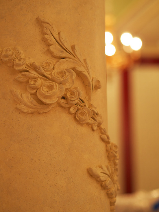 And be sure to look up when passing through the restaurant to take in the rich detail of the ceiling, as well as the roses on the capitals of these pillars. Gorgeous!