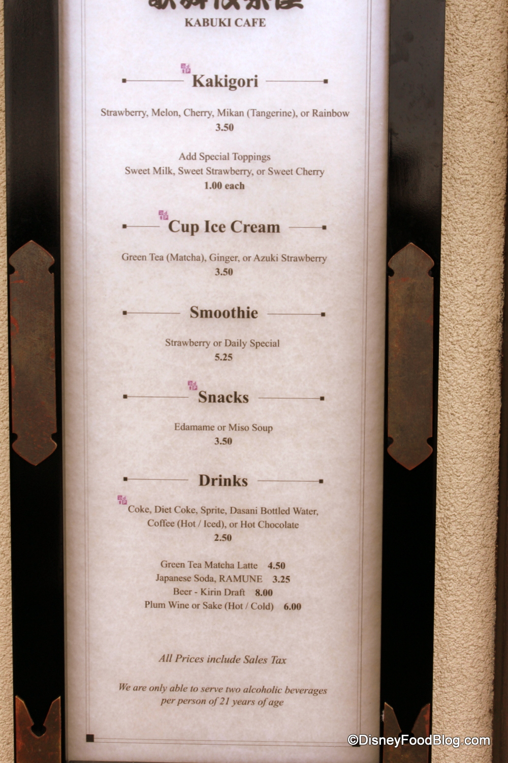 Epcot’s Kabuki Cafe is a quick service kiosk offering varied menu items, from sweet to savory. Located in the Japan pavilion, it replaced the wildly popular Kaki-Gori Stand when it opened. But Kaki-Gori fans can be assured that the sweet, chilly treat is still available here.