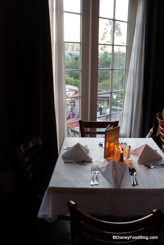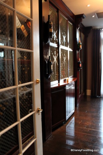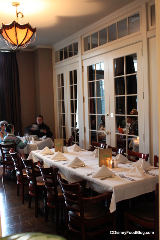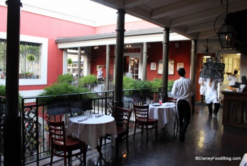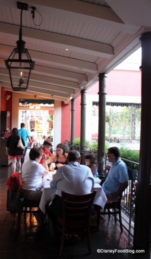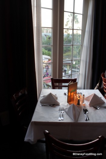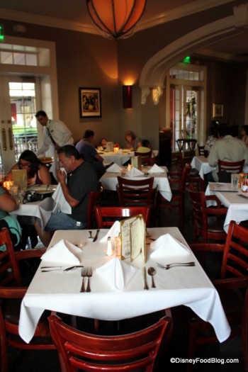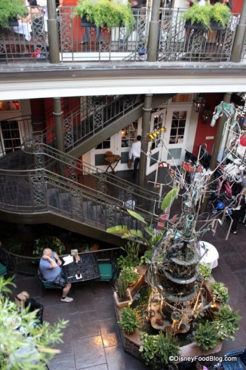 One of our favorite features of the restaurant was the enormous array of varied seating options. We were seated in an upstairs dining room, but tables were to be had on the “jazz balcony” overlooking the hubbub of Downtown Disney, on the courtyard balcony, or in the courtyard itself. There were even cozy places next to the wine cave!