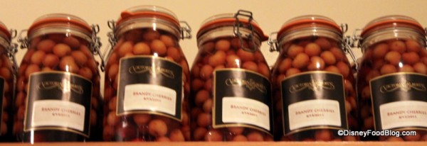 Whew! We’re getting close to the end, but we’ve got some more surprises in store! While seated at the Chef’s Table, you notice rows of these wonderful brandied cherries in lovely glass jars atop the cabinets. Wonder what they’re for?