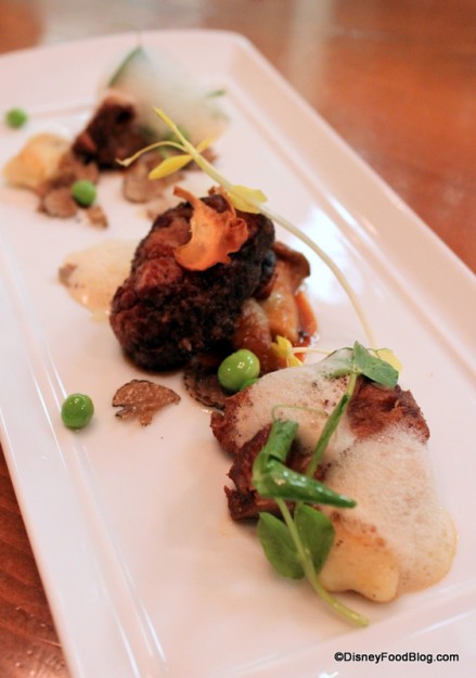 Our next course was another foray into fancy, with Veal Sweetbread and Shank with Chanterelle Mushroom Ragout. It was only the second or third time I’ve had this delicacy, which is actually – yikes! – the thymus gland.