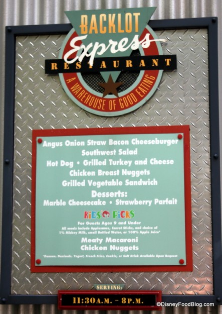 So, here’s the deal on the Backlot Express menu these days: since it’s the “season of new menus,” many counter service locations are trying out new menu items to see how they sell. Here at Backlot, a few new menu items are popping up on weekends. I’m thinking the new items will stick around, but don’t be disappointed if they don’t.