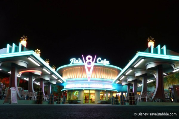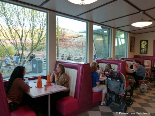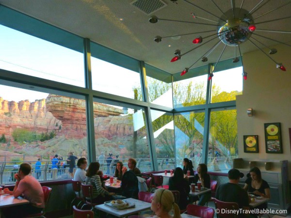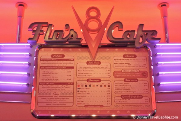 Flo’s has become, hands-down, my family’s favorite restaurant at Disneyland Resort. Between the view of Radiator Springs Racers, the music, the good food, the characters driving past, the decor and the friendly cast, we return time and again to talk, eat, unwind and people-watch. 🙂