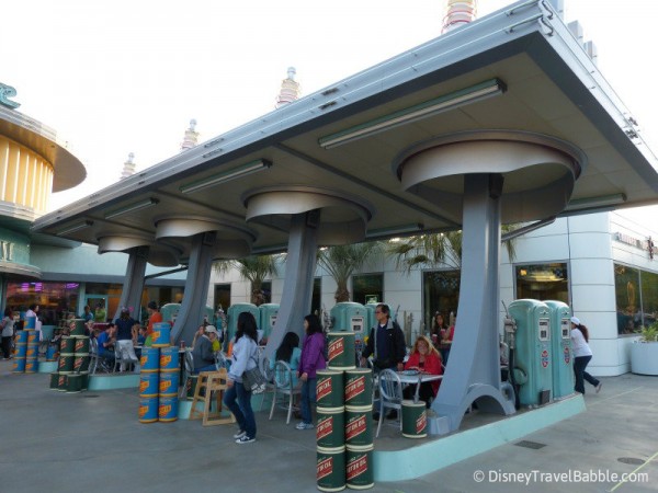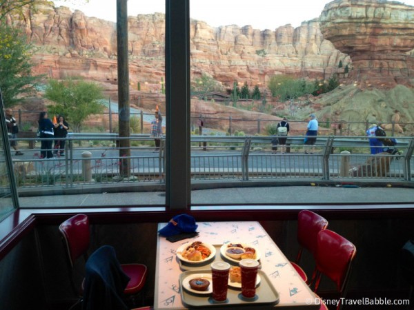 We are usually pretty disappointed by the counter-service options at Disney California Adventure and Disneyland (Jolly Holiday Bakery excepted!), but we waited in the 20-minute line with our hopes high. Who wouldn’t want to eat in a life-size replica of the stylish drive-in from Cars?