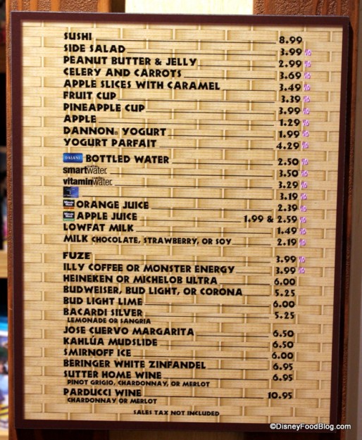 Here’s a list of the grab and go options. Some of the items are pretty standard, but a few really reflect the Polynesian menu. You can grab sushi and a pineapple cup here, for instance.