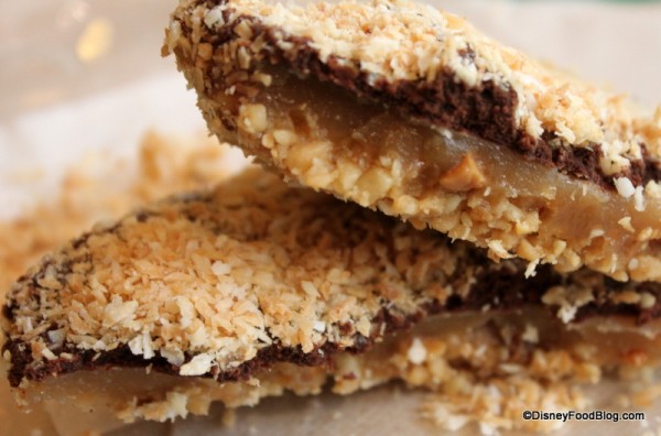 Macadamia nuts provide the foundation, while the top is covered with a generous sprinkle of toasted coconut.