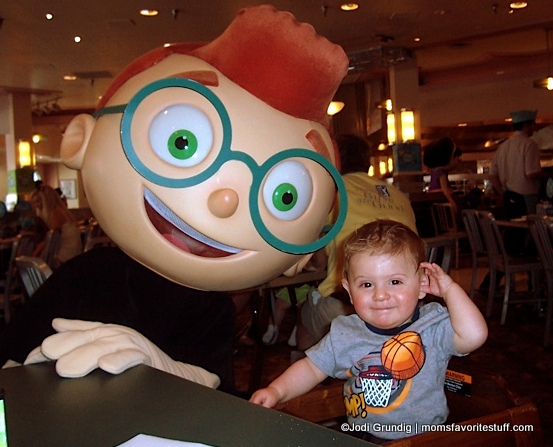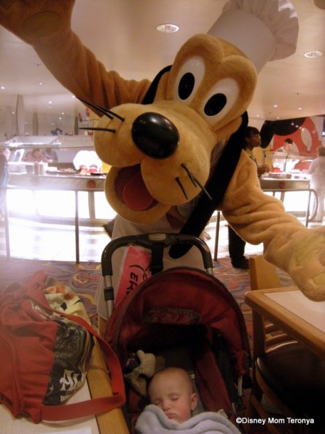 In a larger buffet restaurant like Chef Mickey’s, you may not have a clear sight line from the food to your table. You simply can’t leave the baby there unattended…and this means you have to take the baby with you to get your food.