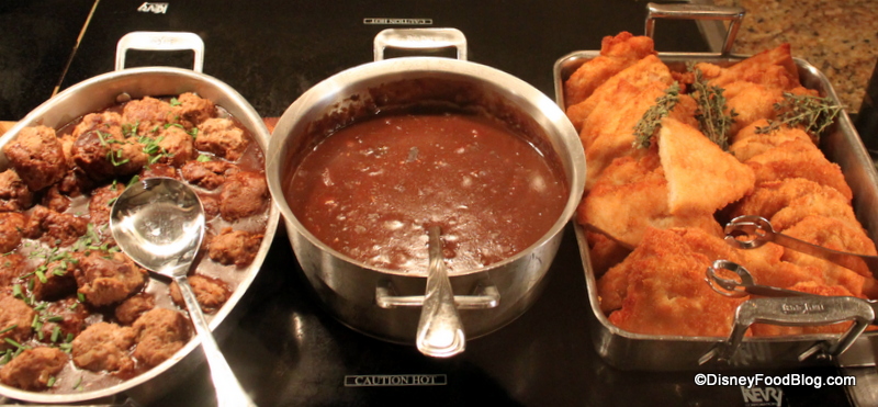 There are also warm Meatballs to contrast with the cold ones you saw earlier. And here, you finally run into Schnitzel — a chicken version. The traditional savory brown sauce known as Hunter’s Sauce is the perfect topping.