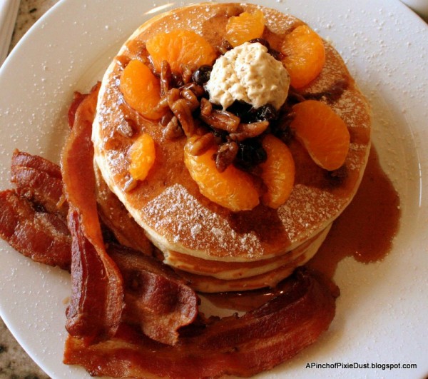 Eventually I decided on the Citrus Pancakes ($11.99). They sounded rather unique: “Roasted Pecan and Sun-dried Cranberry Pancakes served with House-made Orange Butter with choice of Bacon or Sausage.”