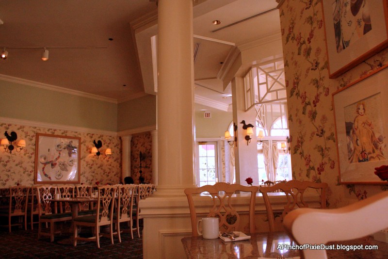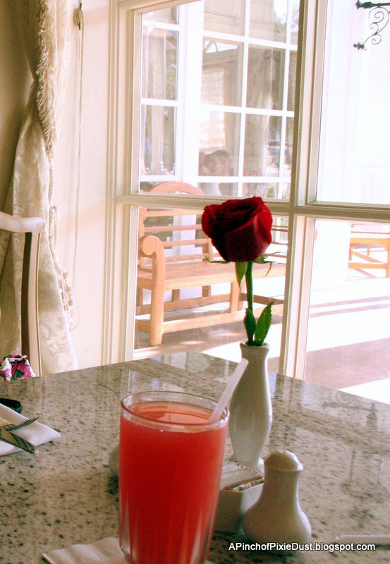 With huge displays of fresh flowers and a red rose on each table, this dining room feels like it might be the country cottage of one of your favorite Disney princesses. (The fact that I saw Cinderella’s coach pass by outside not once but twice while we were dining may have reinforced that impression!)