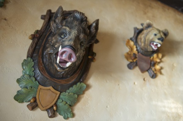 And his animal trophies hang on the wall, celebrating his prowess, of course.