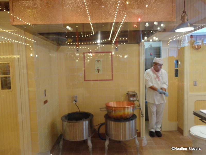 However, the Candy Kitchen has doubled in size and now has room to accommodate two types of candy being made at the same time. In the front area (the part that faces Main Street) Candy maker extraordinaire, Robert and his crew were back in the saddle whipping up some English Toffee.
