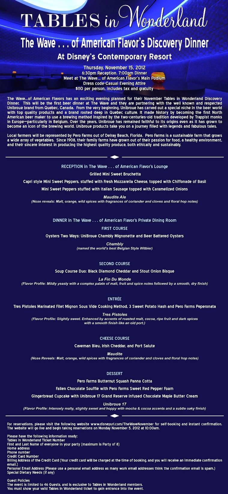 The Wave…of American Flavors has planned a unique event for November’s Tables in Wonderland event. This will be the first beer dinner at The Wave, and they are partnering with the Unibroue brand from Quebec, Canada.