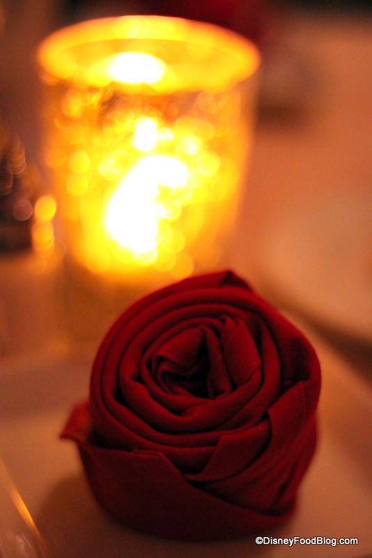 All place settings at Be Our Guest are accentuated with a rose-folded napkin.