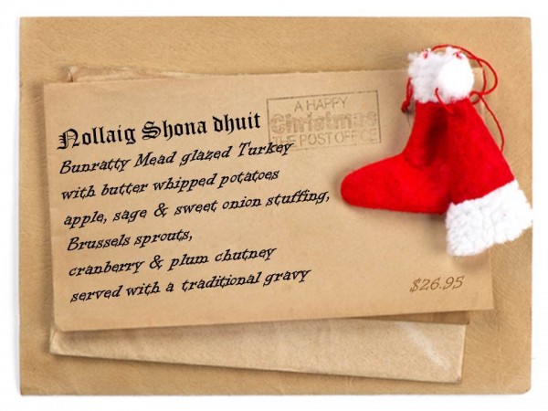In addition to a delicious Bunratty Mead glazed turkey, trimmings will include butter whipped potatoes, apple sage & sweet onion stuffing, Brussels sprouts, and cranberry & plum chutney served with a traditional gravy. Cost is $26.95 per person.
