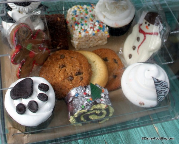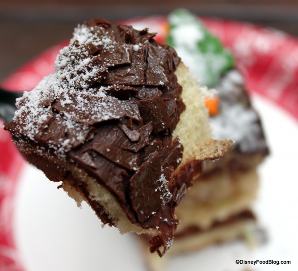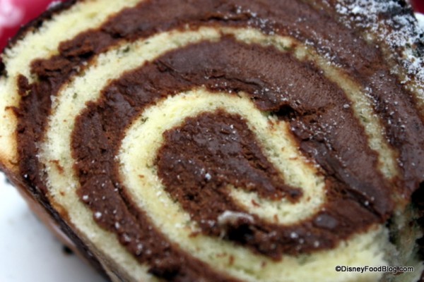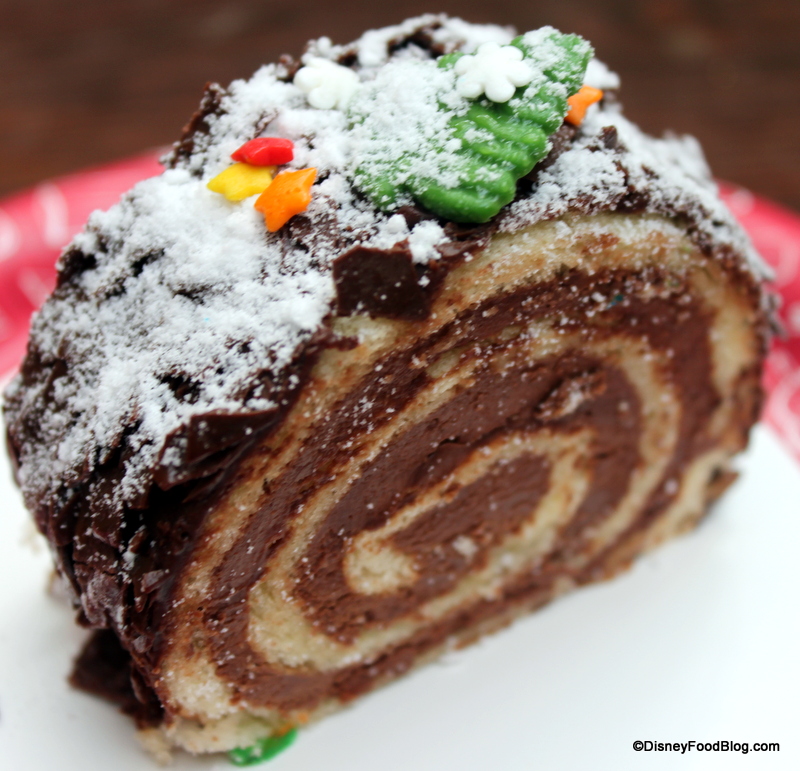 During my regular “casing” of Animal Kingdom on this trip, I found a few new holiday goodies at Kusafiri. There’s a red-and-green frosted chocolate brownie, a few holiday cookies, and the Yule Log, which I couldn’t wait to try!
