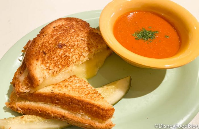 To begin your Disneyland grilled cheese crawl, stop by Jolly Holiday Bakery for their Grilled Cheese and Tomato Soup combo.