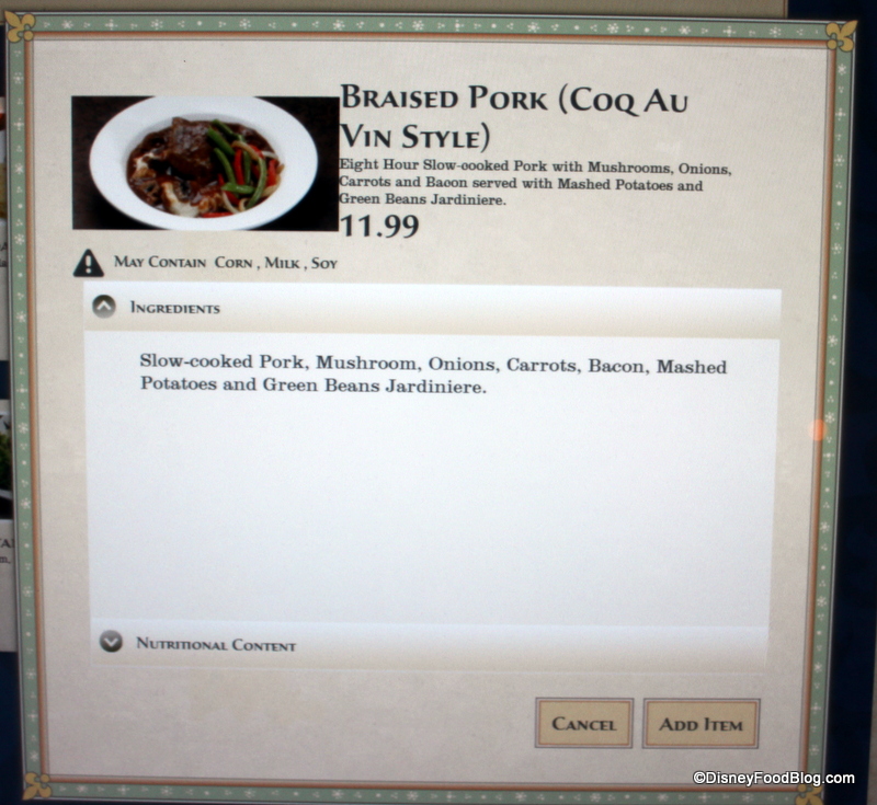 We chose two wonderful dishes for our first trip to Be Our Guest for lunch. First up: the Braised Pork, Coq au Vin Style.