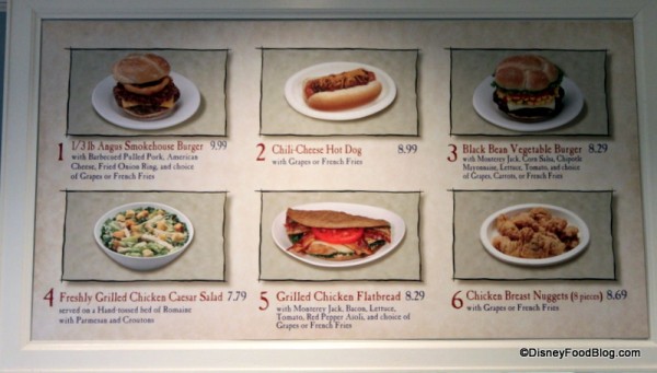 My qualms with this place are completely confirmed by the menu board. THIS is really the best they could do with American food? I get the need for a hamburger and chicken nuggets place somewhere in Epcot, I get that there are lots of kids and lots of people who aren’t too interested in counter service sushi or Moroccan platters. But do they really need to have a CESAR SALAD? A black bean burger with salsa? Spaghetti and meatballs on the children’s menu? I know those are American versions of Italian and Mexican food but there has to be some distinctly American choices for a less adventurous palate. How about BBQ ribs, or Buffalo wings, or a Philly cheese steak? How about instead of the same Caesar salad they serve everywhere in Walt Disney World, they put on something a bit more modernly American like a BLT salad or something with some fresh fruit or craisins, or a spinach salad?
