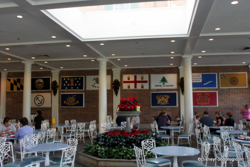 Inside, you’ll find ample seating in the atrium-style dining area. Skylights allow for plenty of natural light, and flags from the original colonies line the brick walls. You can see them up close in this post.