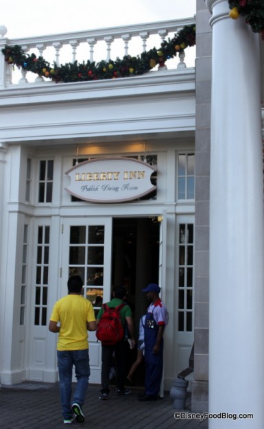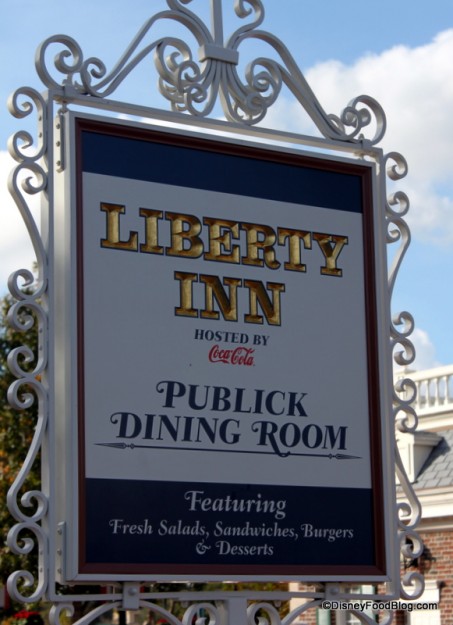 “Liberty Inn Publick Dining Room” — known to most of us as Liberty Inn — is located in the large building that serves as the central location when you look at World Showcase. Situated across from the American Gardens Theatre, the building also houses the American Adventure, an animatronic and film attraction; and an American history mini-museum (a great place to get away from the crowds!).